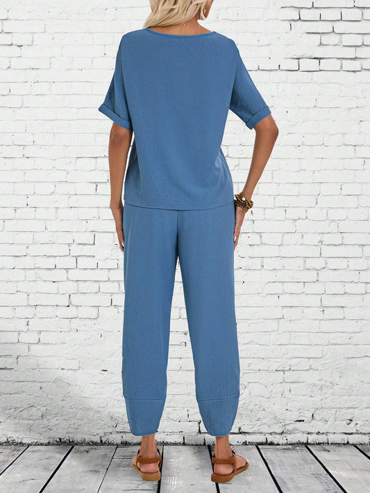 Elegante Tweedelige Set - Blauw - Ronde Hals, Korte Mouwen - Elastaan en Rayon - Geschikt voor Diverse Gelegenheden